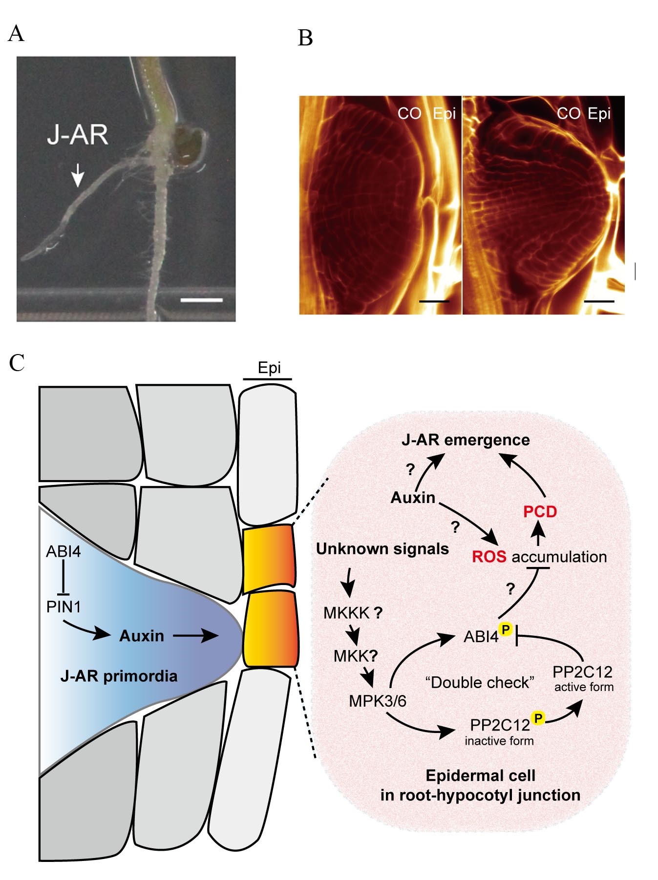 迟伟研究组以模式植物拟南芥为材料,对一种特殊形式不定根的生成机理进行了深入研究。研究发现:在较低的光照条件下,拟南芥几乎不产生任何形式的不定根。当光照强度提高时,在拟南芥主根和胚轴的节点处(root–hypocotyl junction) 会诱导产生大量的不定根(称作J-不定根)。当拟南芥的一个转录因子ABI4突变后,拟南芥即使在较低的光照条件下仍然会产生大量J-不定根。这表明ABI4是J-不定根发生的负调控因子。进一步研究发现,ABI4蛋白的缺失促使活性氧分子特异地在节点位置的表皮细胞中大量累积,诱发了表皮细胞的细胞凋亡。这一过程会减弱根原基突破表皮细胞的机械阻力,促进J-不定根的发生和生长。