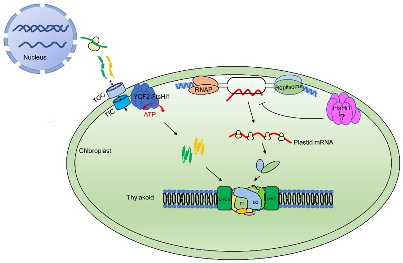 叶绿体是植物进行光合作用的细胞器,正常发育过程受到核基因组和叶绿体基因组在多个层次的协同调控,核质互作的分子机理一直是叶绿体生物发生的核心科学问题之一。光合膜蛋白复合体的反应中心亚基通常由叶绿体基因编码,而外周蛋白和天线蛋白由核基因组编码。这些核基因组编码的叶绿体蛋白,在细胞质中合成,然后通过叶绿体被膜上的TOC-TIC蛋白转运装置运输至叶绿体,同叶绿体基因组编码的亚基组装形成超级复合体。但是目前为止,叶绿体蛋白转运装置和基因表达装置协同调控机制并不清楚。