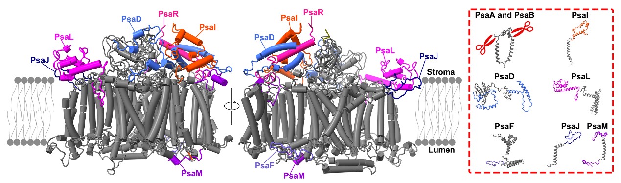 灰色显示PSI核心蛋白的保守二级结构,彩色表明甲藻进化出新的蛋白片段